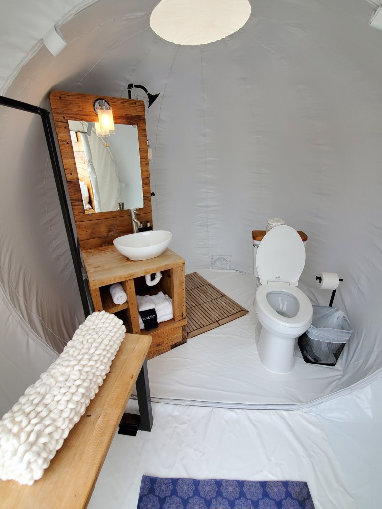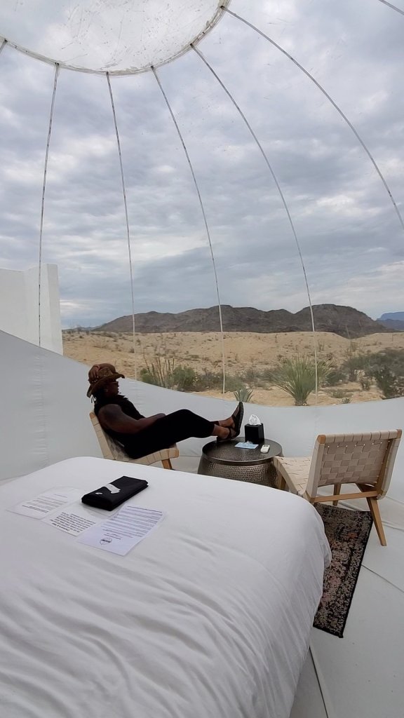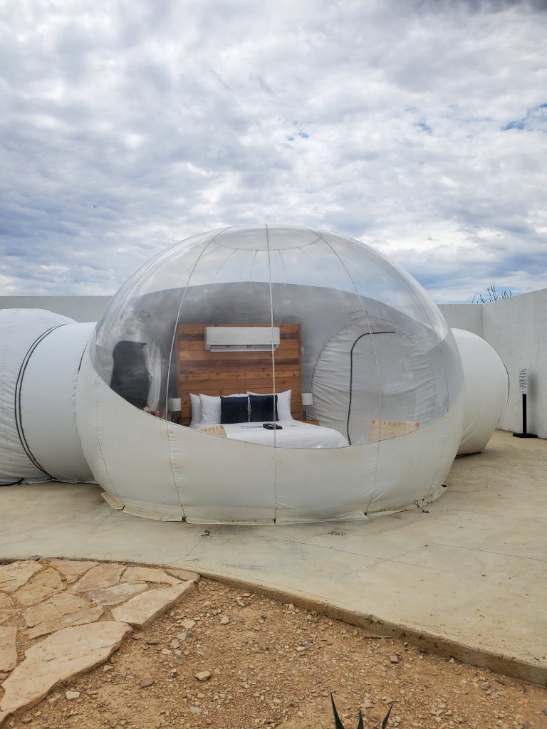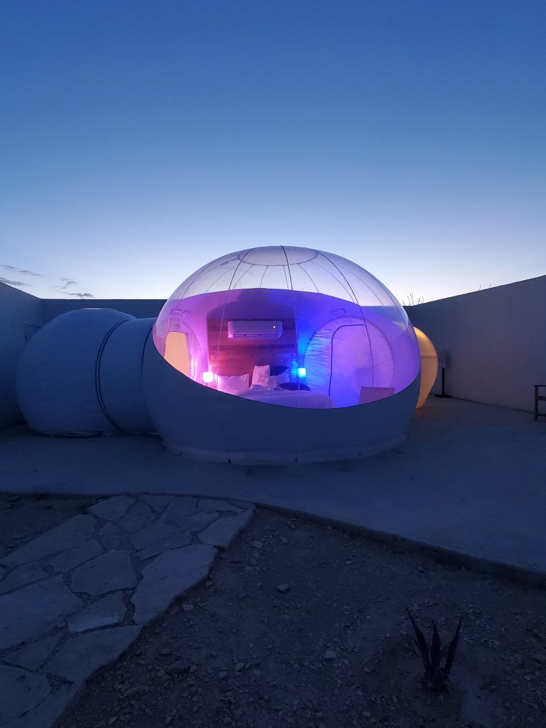After a long day of traveling it was time to check in to our sleeping accommodations. In the desert of West Texas we arrived at Basecamp Terlingua. Basecamp Terlingua offers several glamping like options but the most unique one is the bubble. Has there ever been so much stuff going on that you just wanted to jump inside of a snow globe and live there for a while? Well now you can! Kinda~