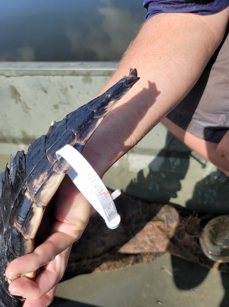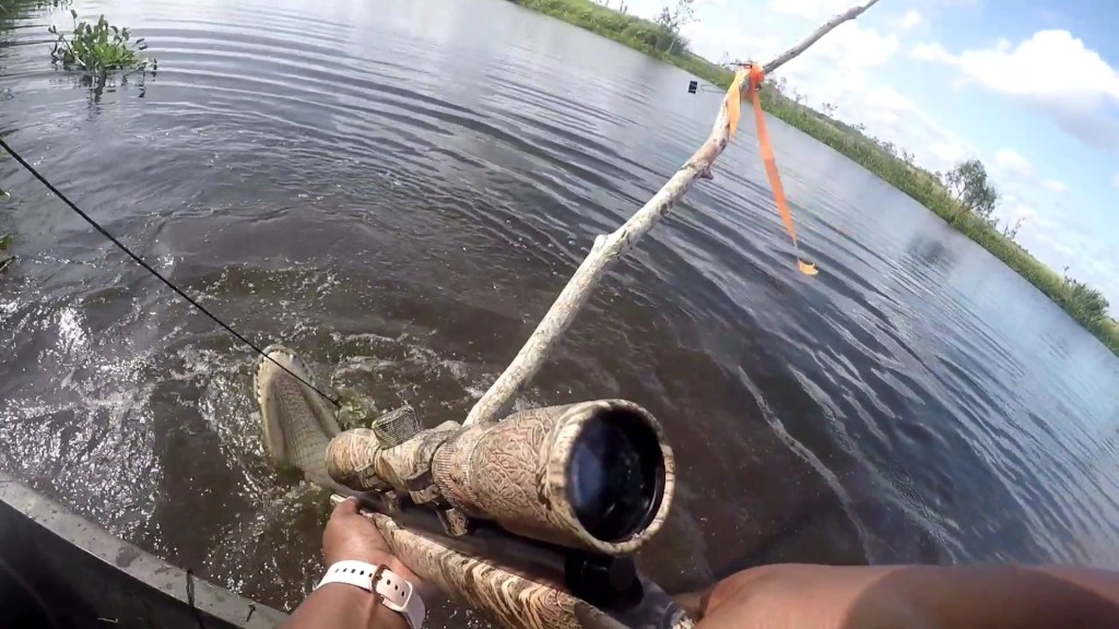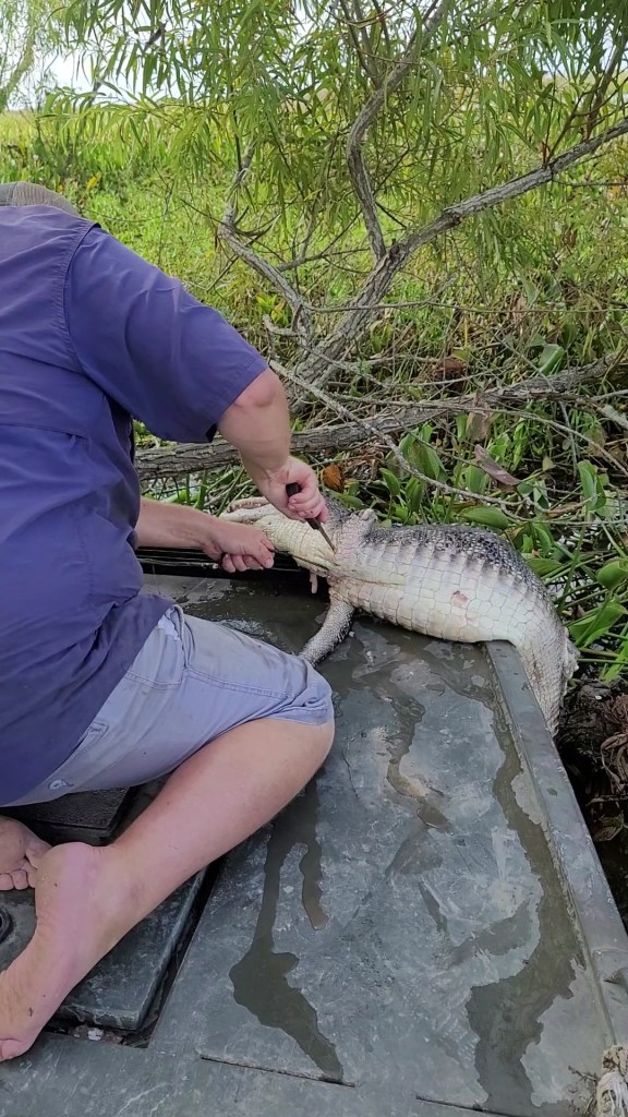 We finally came across a downed line and it was time to see what we had. We pulled the line towards the boat and the gators head popped up. My adrenaline instantly jumped up a few notches! I grabbed the rifle and steadied myself to prepare for the kill shot. There’s a soft u-shaped spot on the back of their skull where their medulla oblongata is located. After a clear shot there, the gator will die instantly well hopefully. I pointed the rifle over the boat at the gators kill spot, pulled the trigger and the smell of sulphur filled the swampy air. You have to wait a minute to make sure that the gator is dead before you try to pull him onto the boat. If his eyes are open that sucker is not dead. Shoot him again or you could get a knife and jab the u-shaped soft spot for the coup de grâce! Once the gator is dead he is pulled on the boat and his tail is tagged!