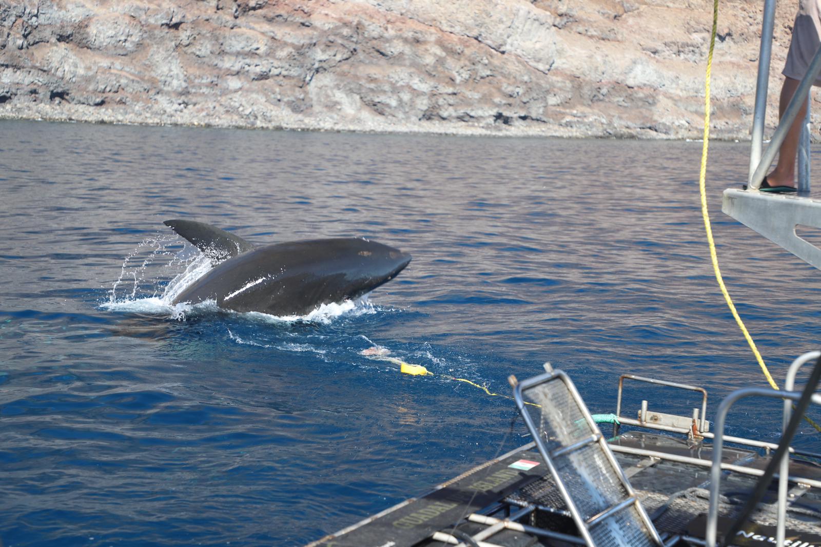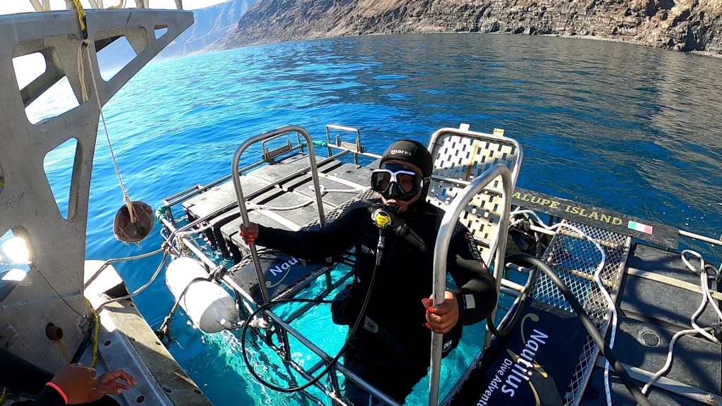 We eventually departed the dock to make the 20 hour boat trip to Isla Guadalupe. The seas were rough with 12+ ft waves and I’m glad that I had plenty of motion sickness medication. We arrived at Guadalupe Island around 4:30 am and the crew immediately got to work prepping the cages for the divers to jump in at 6:30 am.