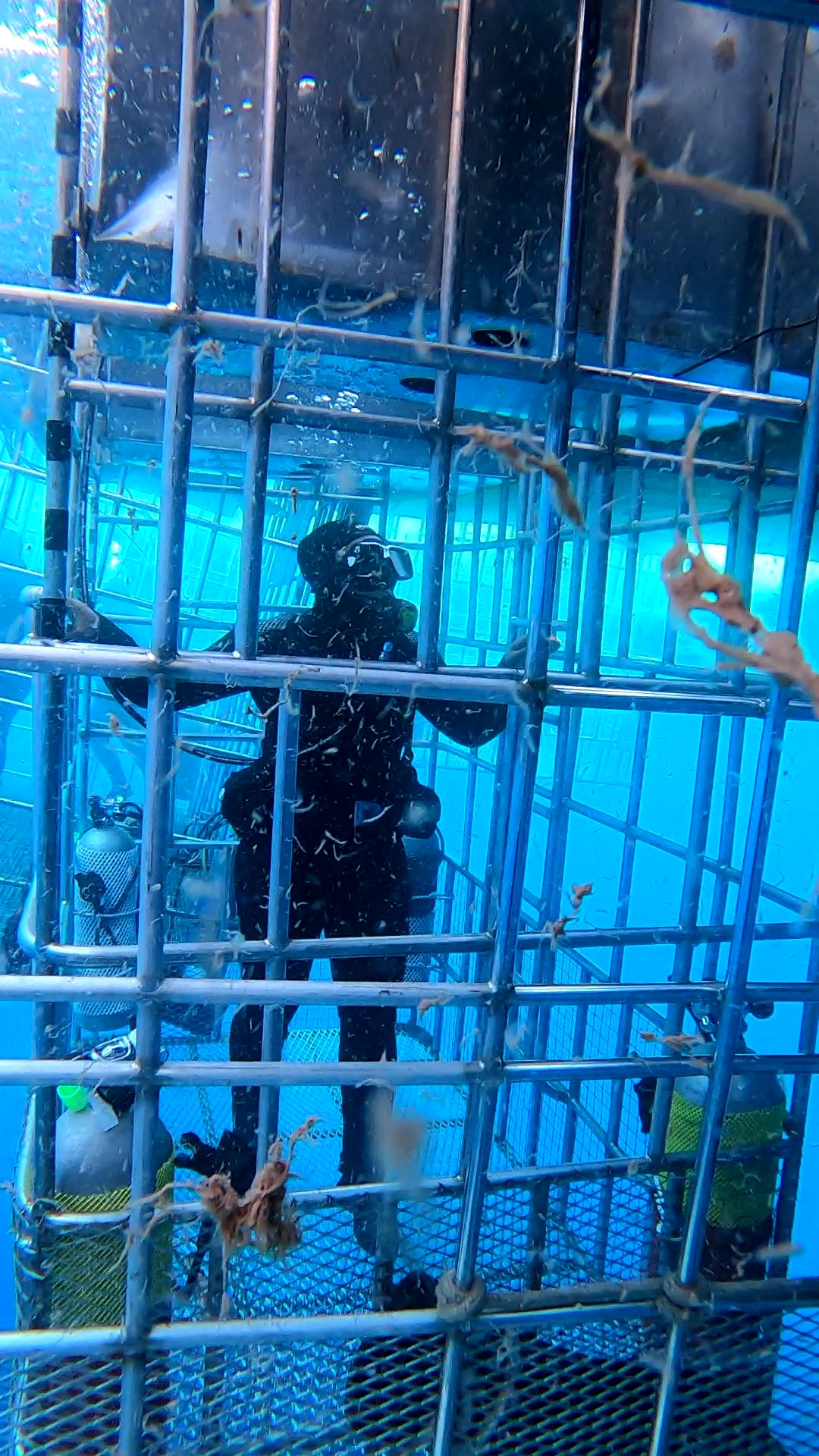 Cage diving in Isla Guadalupe is not solely reserved for certified scuba divers. Anyone can also partake in diving with Great White sharks through the use of a hookah surface air system and cages that stay on the surface. If you do have your certification, you can make use of one of the submersible cages that descend down into the blue where sharks congregate. On our boat there were 2 large surface cages and 3 submersible cages.